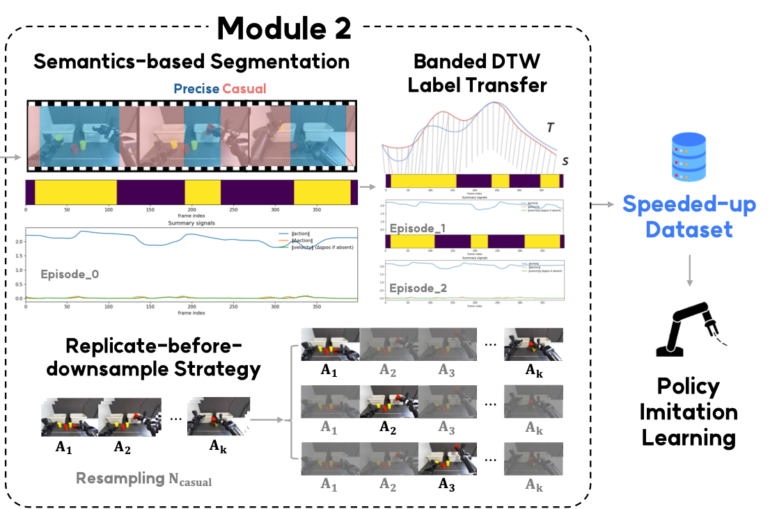 Dataset-wide labels are propagated using banded Dynamic Time Warping on proprioception–action features.